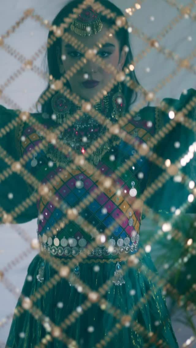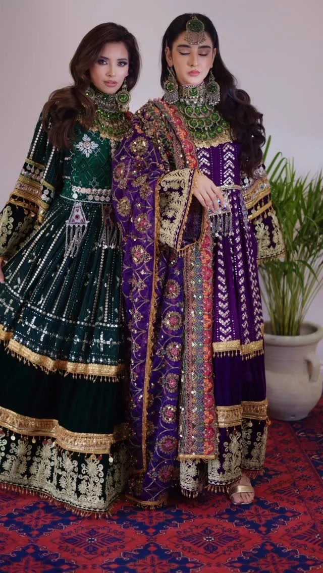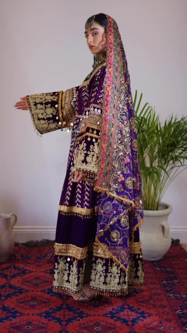 This is a 3-piece set made with Velvet. The set includes a dress with a long train, trousers and a long chiffon scarf. One size, adjustable.